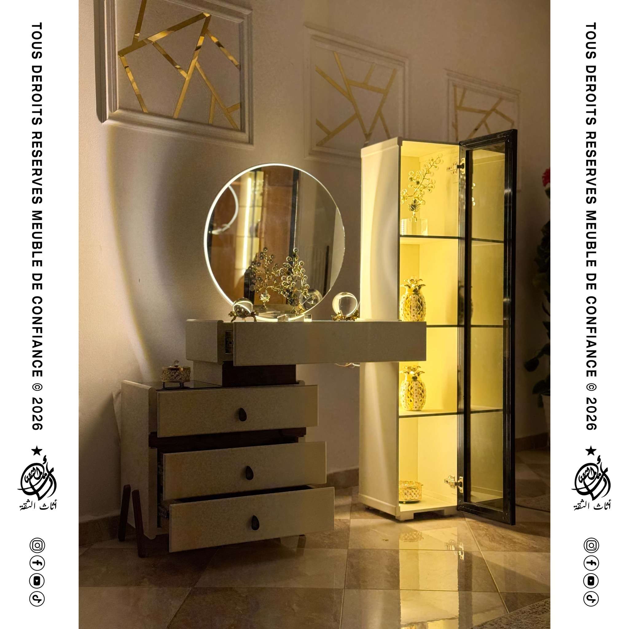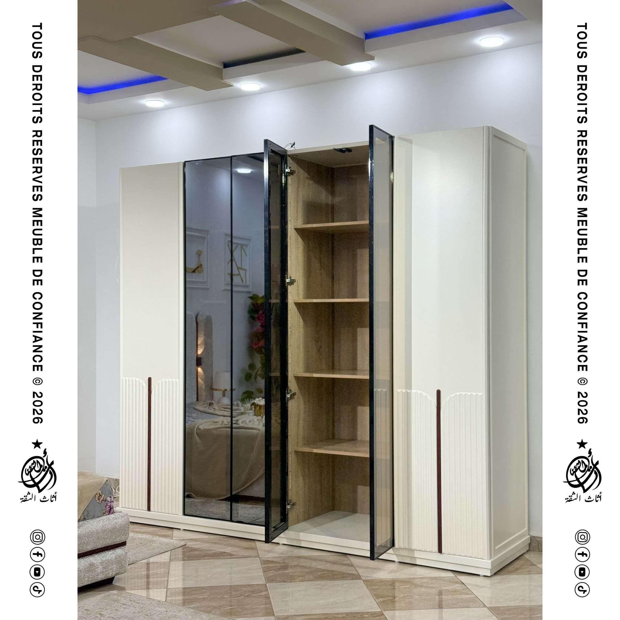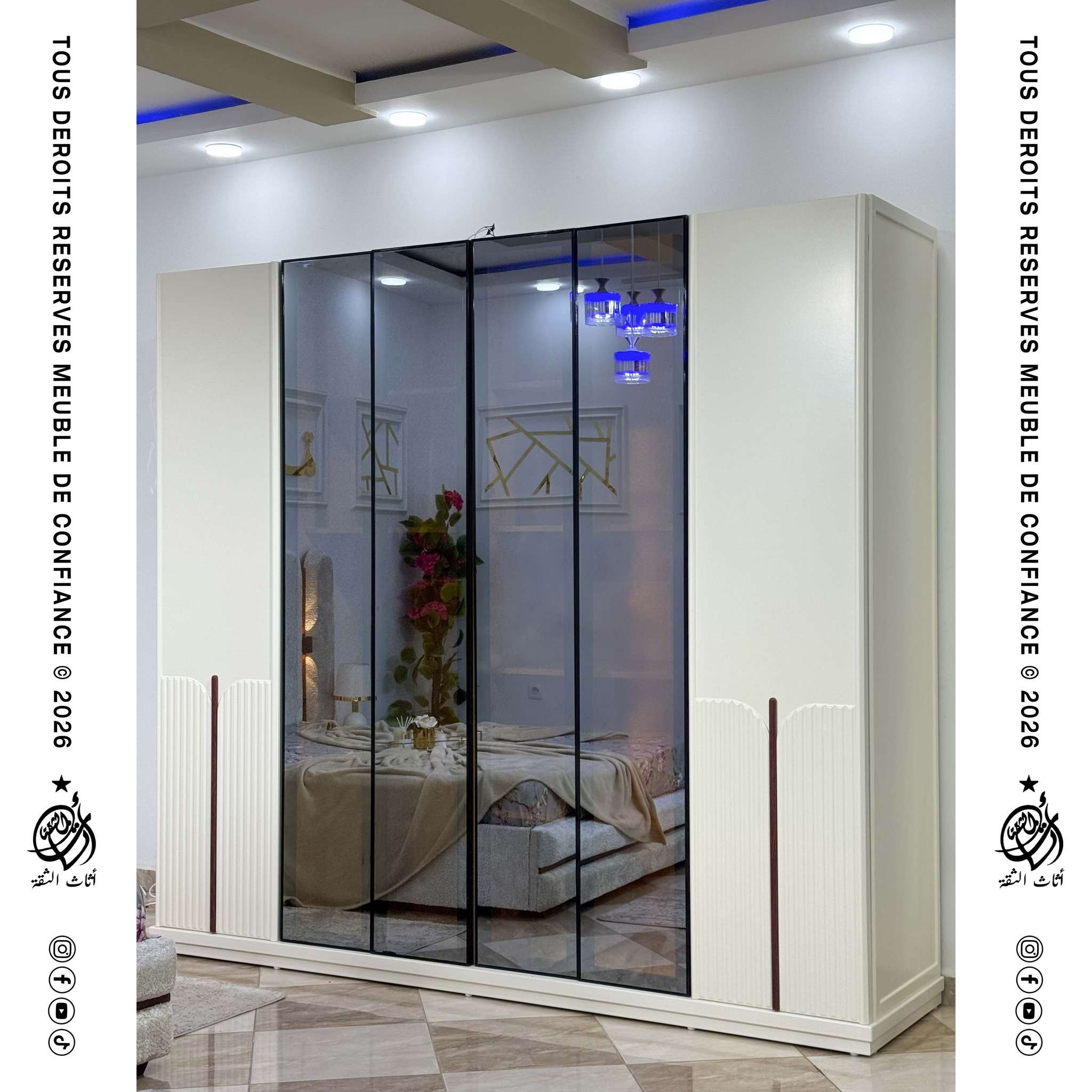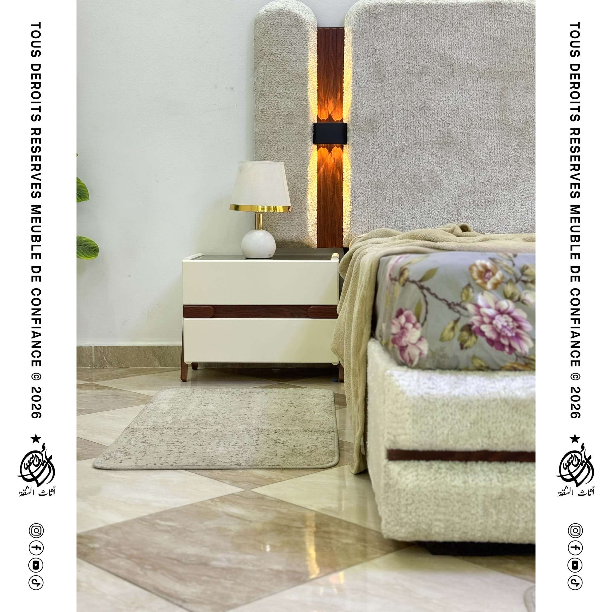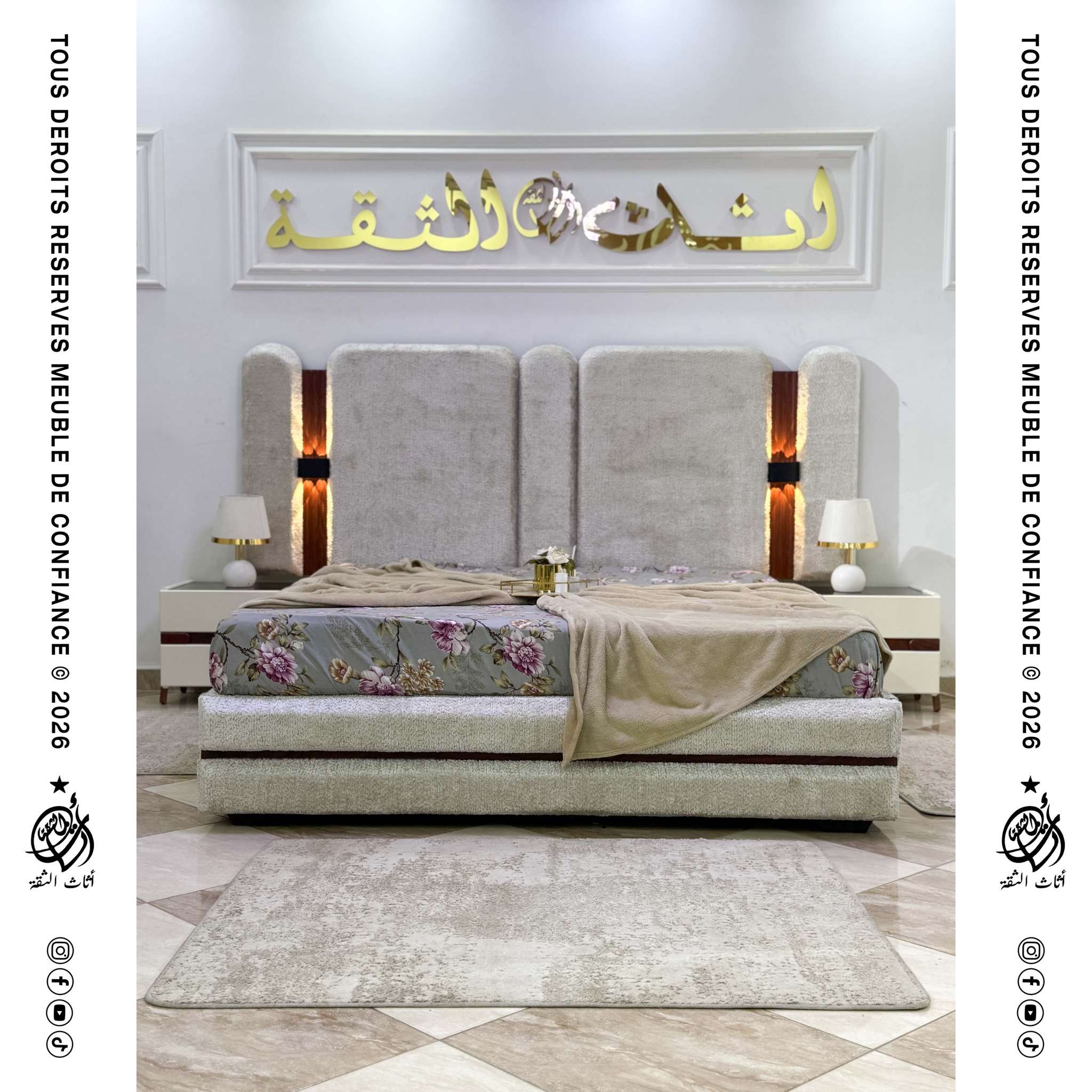 Damas Pro – Élégance et confort Apportez une touche de raffinement à votre intérieur avec cette chambre à coucher moderne au design élégant et harmonieux. Composée d’un lit avec tête capitonnée, de tables de chevet assorties, d’une coiffeuse avec miroir et d’une grande armoire avec portes vitrées, cette collection allie esthétique contemporaine et fonctionnalité. La tête de lit rembourrée offre un confort optimal tout en ajoutant une note luxueuse à l’ensemble. Les finitions soignées, les détails décoratifs muraux et l’éclairage intégré créent une ambiance chaleureuse et apaisante, idéale pour vos moments de repos. L’armoire spacieuse avec vitrines apporte une solution de rangement pratique tout en mettant en valeur vos effets personnels. La coiffeuse élégante complète parfaitement l’ensemble pour un espace à la fois pratique et sophistiqué. Caractéristiques : Design moderne et épuré Lit avec tête capitonnée confortable Armoire grande capacité avec portes vitrées Coiffeuse avec miroir intégré Finitions haut de gamme Éclairage décoratif intégré Transformez votre chambre en un espace chic, confortable et parfaitement organisé.