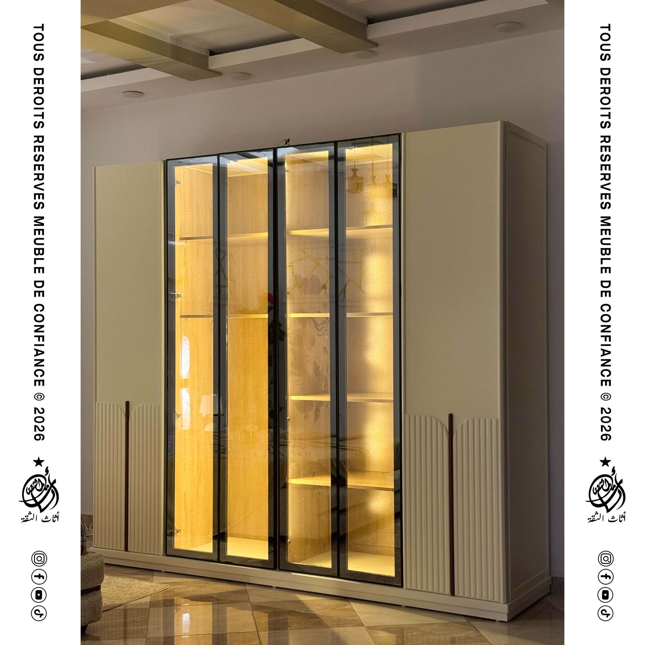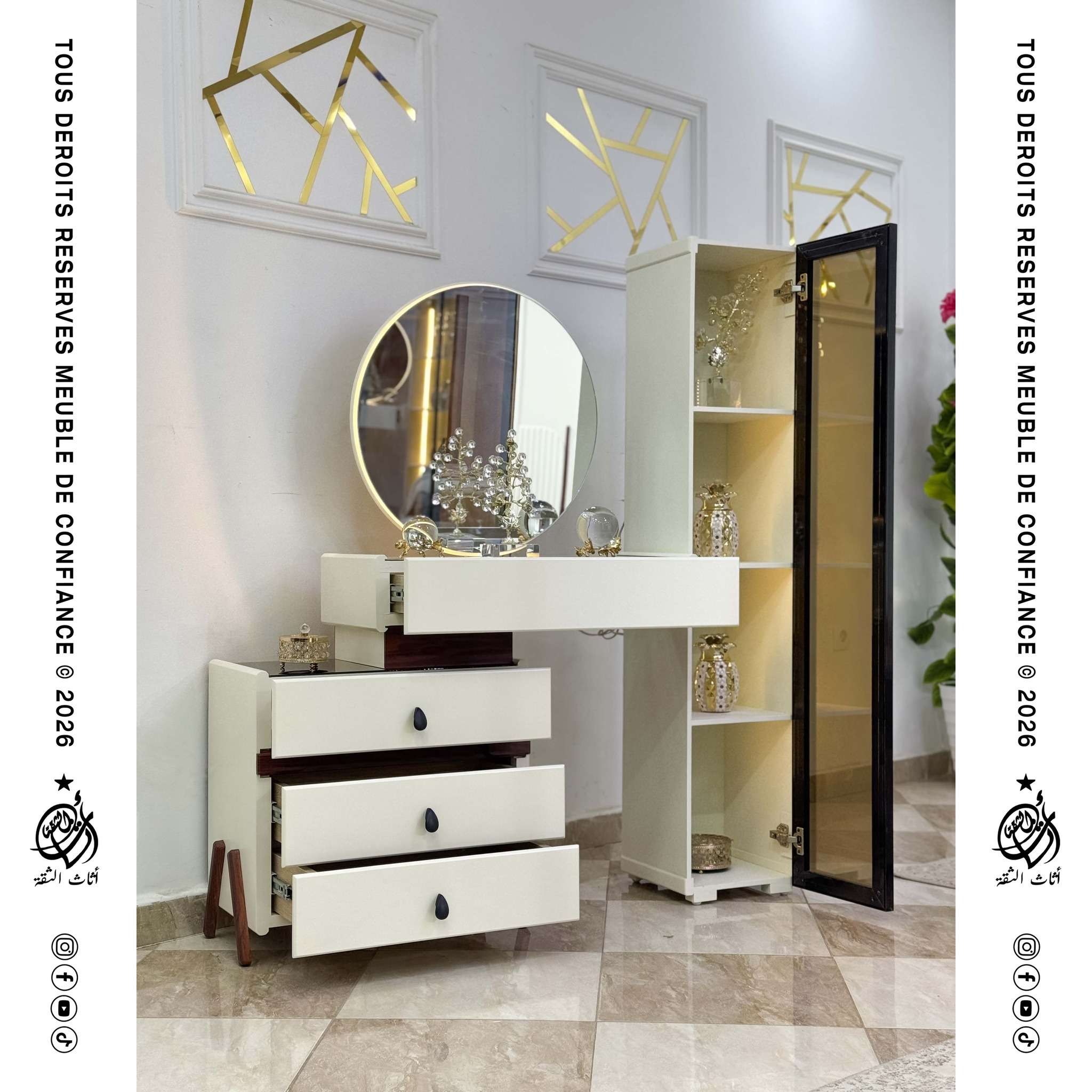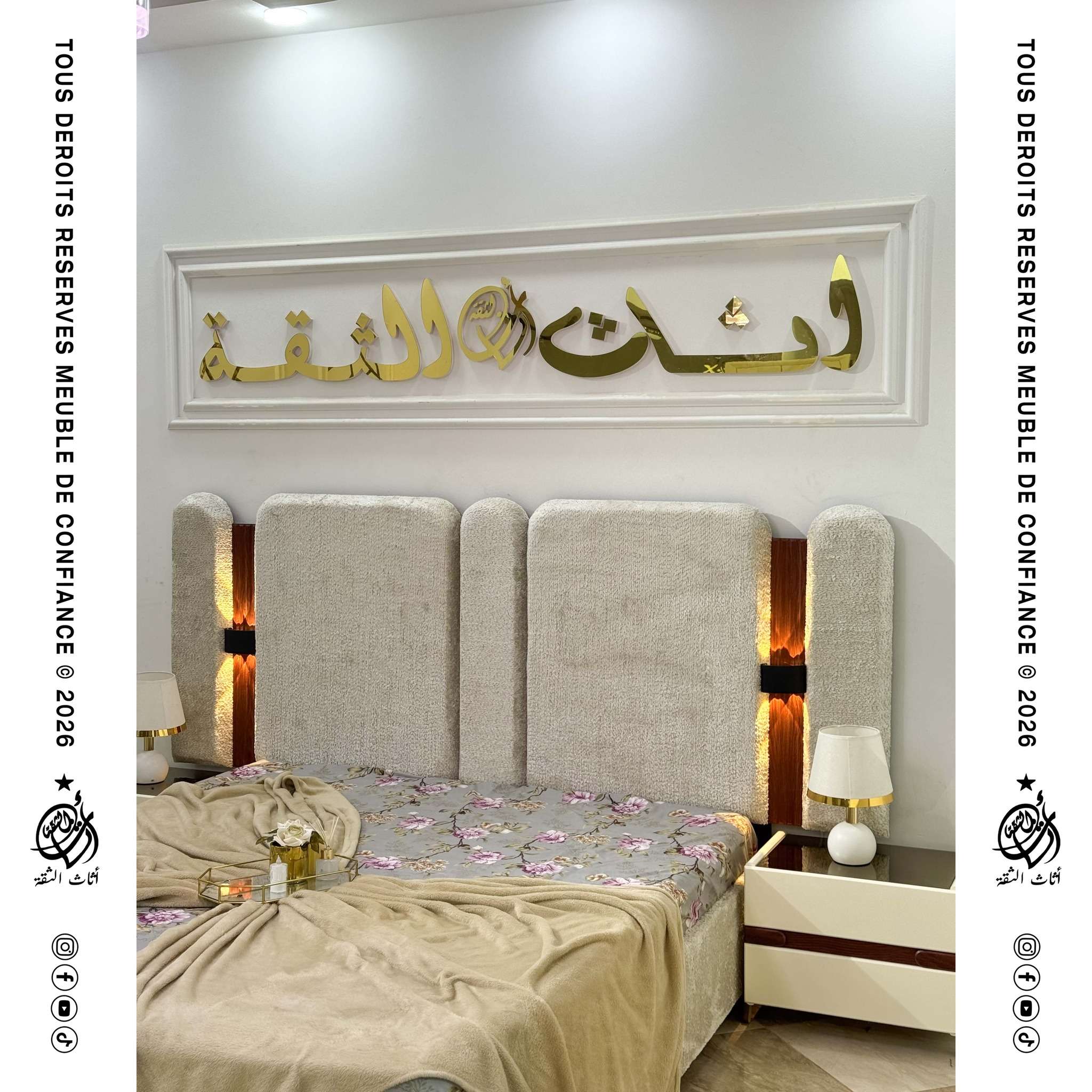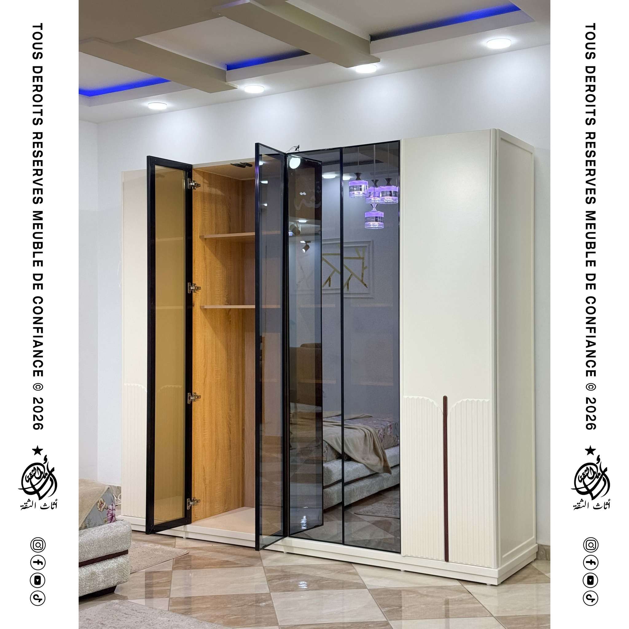 Damas Pro – Élégance et confort Apportez une touche de raffinement à votre intérieur avec cette chambre à coucher moderne au design élégant et harmonieux. Composée d’un lit avec tête capitonnée, de tables de chevet assorties, d’une coiffeuse avec miroir et d’une grande armoire avec portes vitrées, cette collection allie esthétique contemporaine et fonctionnalité. La tête de lit rembourrée offre un confort optimal tout en ajoutant une note luxueuse à l’ensemble. Les finitions soignées, les détails décoratifs muraux et l’éclairage intégré créent une ambiance chaleureuse et apaisante, idéale pour vos moments de repos. L’armoire spacieuse avec vitrines apporte une solution de rangement pratique tout en mettant en valeur vos effets personnels. La coiffeuse élégante complète parfaitement l’ensemble pour un espace à la fois pratique et sophistiqué. Caractéristiques : Design moderne et épuré Lit avec tête capitonnée confortable Armoire grande capacité avec portes vitrées Coiffeuse avec miroir intégré Finitions haut de gamme Éclairage décoratif intégré Transformez votre chambre en un espace chic, confortable et parfaitement organisé.